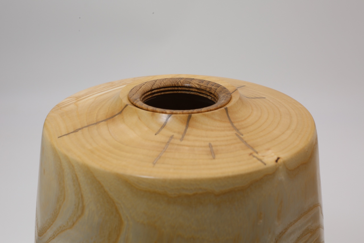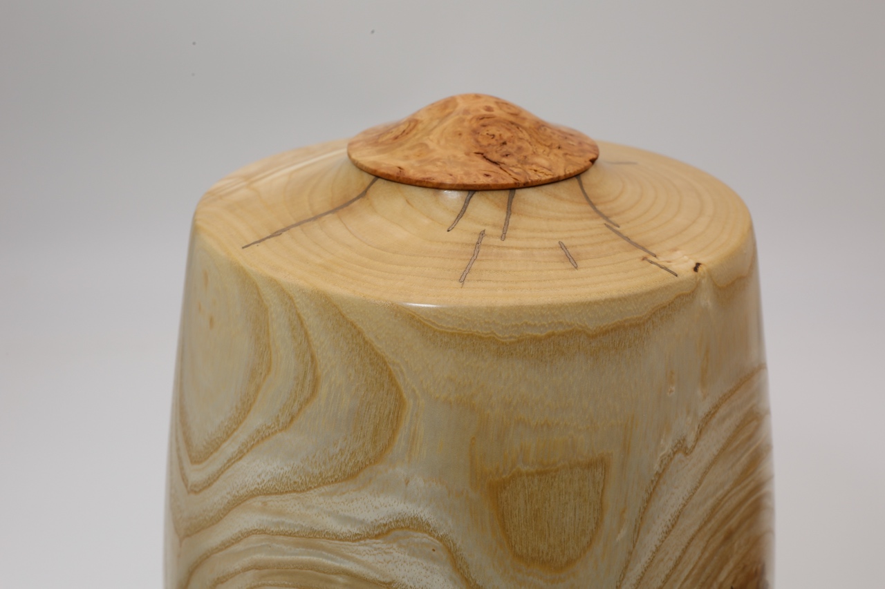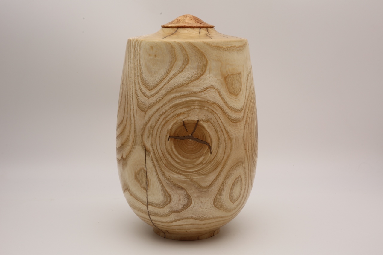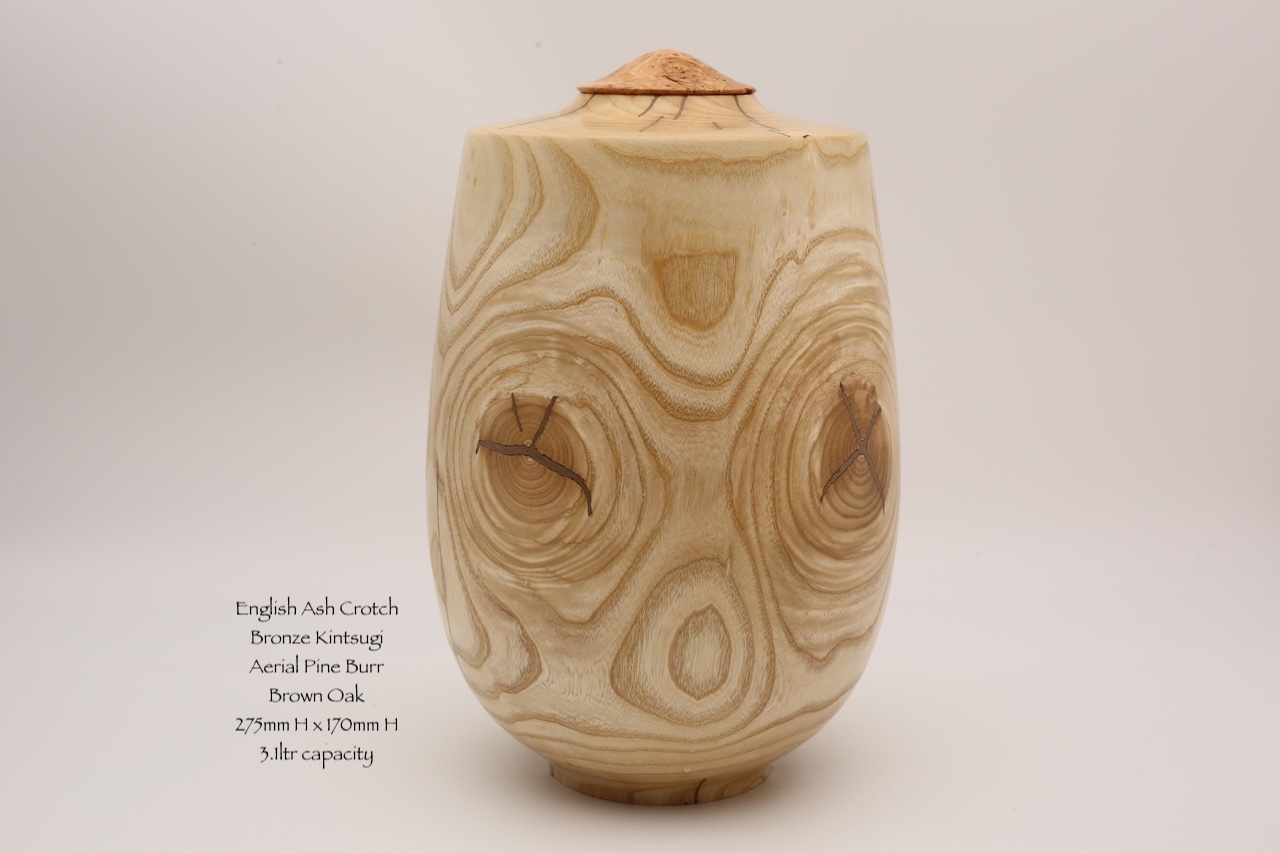 This piece of Ash was brought  by a student it to use on a hollowing course. We discussed the suitability of using it on the course and decided it wasn't suitable for the basic hollowing course but he wanted to give it a go because he had brought it with him, it had been growing in his garden so he created the outside shape with some guidance. In doing so he got to understand why it was a difficult piece of wood for his first project, he found out that the knots where difficult to deal with on the outside The part turned blank sat around for a few years and because it hadn't been hollowed out it developed quite a few splits, normally I wouldn't have bothered with finishing it but I liked the grain patterns so I did I filling all the splits with Bronze epoxy. The threaded insert is Brown Oak and the lid is part of a pine burr ball that had been growing 12m up a tree iand it came to me from a sawmill in Gloucestershire.
